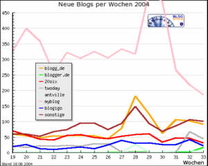 eine kurze anmerkung zu unseren zahlen: wir zählen nur weblogs, die (uns) pingen, rss haben und mehr als einen eintrag vorweisen können. daher beispielsweise der verlauf von twoday, die uns einige wochen lang nicht angepingt haben. die jeweiligen anmeldungen bei den hostern können also durchaus anders aussehen. bei blogg.de fallen mehr als 1000 weblogs aus der statistik, weil sie nicht mind. 2 einträge vorweisen können, bei 20six gibt es sicherlich viele weblogs ohne rss.