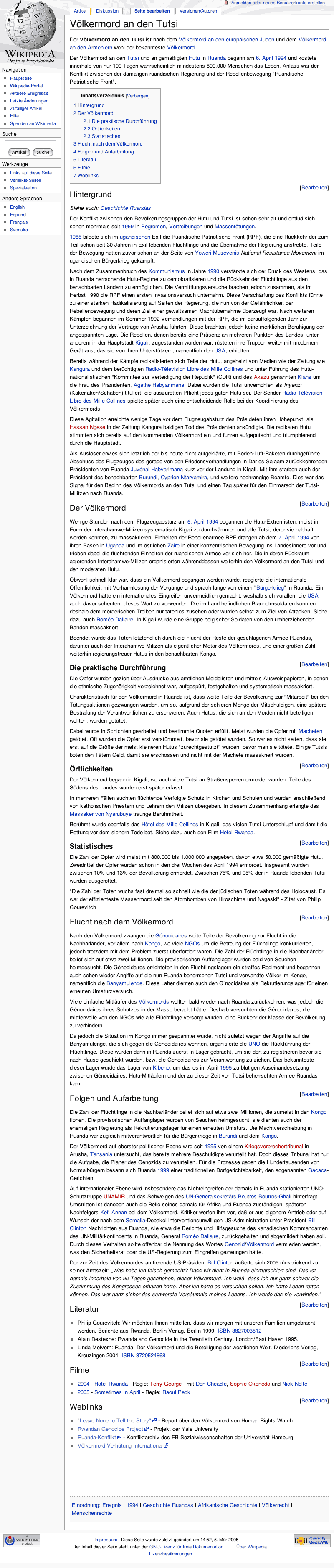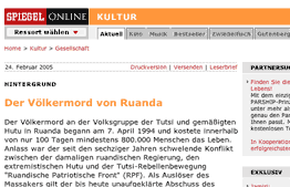 Zum Thema: Es gibt bei Spiegel Online einen namentlich nicht gekennzeichneten Hintergrundbericht zum Völkermord in Ruanda vom 24. Febraur 2005. Es ist sehr wahrscheinlich, dass dieser namentlich nicht Genannte vom Spiegel dafür Geld kassiert hat, aber der Autor des Artikels ist er in weitesten Teilen nicht. Statt dessen hat er Texte aus Hintergrund und Hauptteil des Wikipedia-Artikels zum Völkermord in Ruanda kopiert und teilweise in eine neue Reihenfolge gebracht. Der Eigenanteil am Beitrag besteht also in den ersten vier Absätzen ausschliesslich in einer leichten Umgestaltung des Wikipedia-Textes. Dabei hat er auch eine deutliche Komma-Unsauberkeit übernommen, die dann auch noch die Endkontrolle übersehen hat: