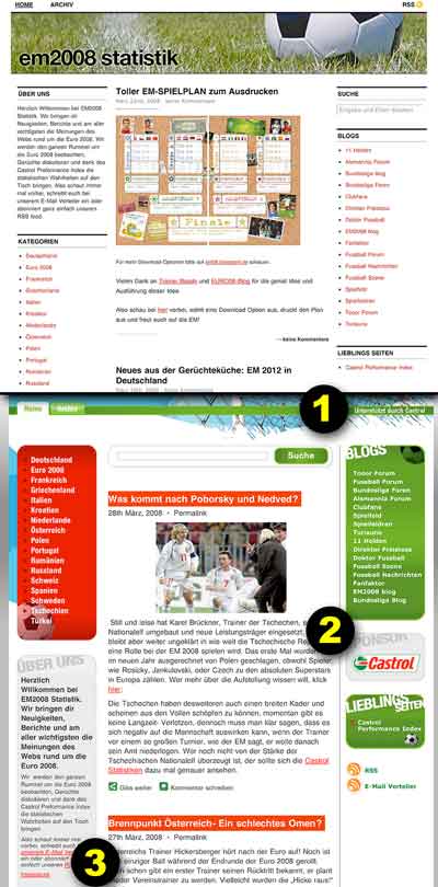 Ein Blick auf die genannte deutsche Website: kein Impressum. Der Name Castrol tauchte in jedem zweiten Blogeintrag auf, war in der Navigation mehrfach verlinkt. Die Blogeinträge nicht namentlich gezeichnet. Viele Bezüge auf andere Blogs. Fishing for Backlinks? Die polnische Website von der die eMail-Adresse stammt, war ähnlich aufgebaut: EM 2008, Castrol, Castrol, Castrol, keine Namen, keine Macher, kein Impressum.